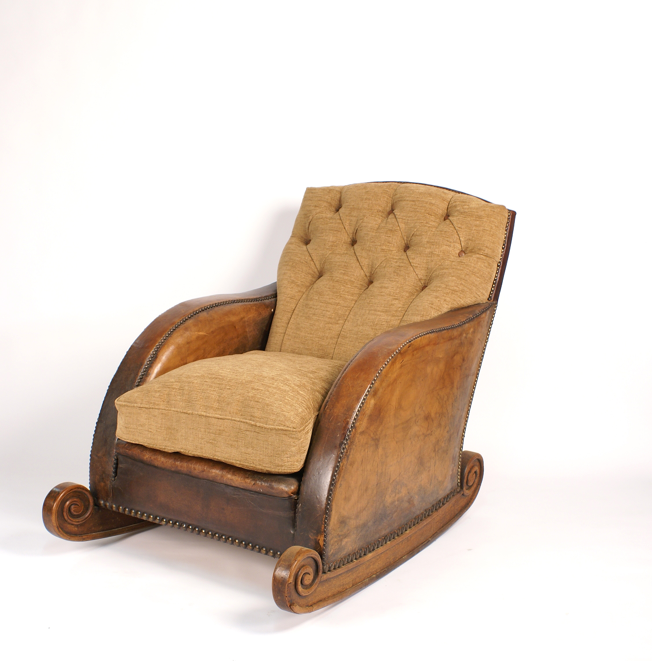POLTRONA A SLITTA XIX Sec. rivestita in cuoio con schienale e seduta imbottiti e rivestiti in tessuto, poggiante su basi in legno 94x71x110 cm.