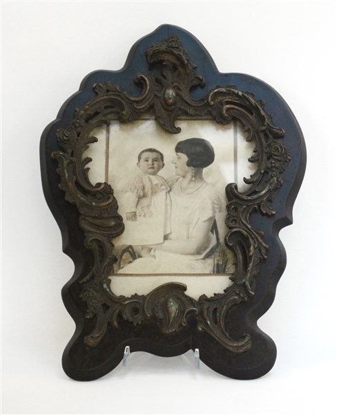 Cornice in bronzo decorata a rocaille e fiori montata su pannello in legno (cm 50x38) (difetti)