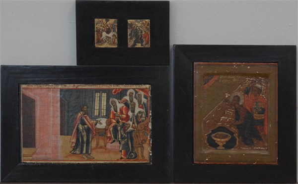 Arte russa, secolo XIX. Gruppo di quattro dipinti in tre cornici ad olio su tavola raffiguranti scene della vita di Cristo (misure differenti) (difetti)
