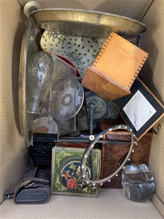 Cartone contenente numerosi oggetti di diversa epoca, materiale e decoro (difet