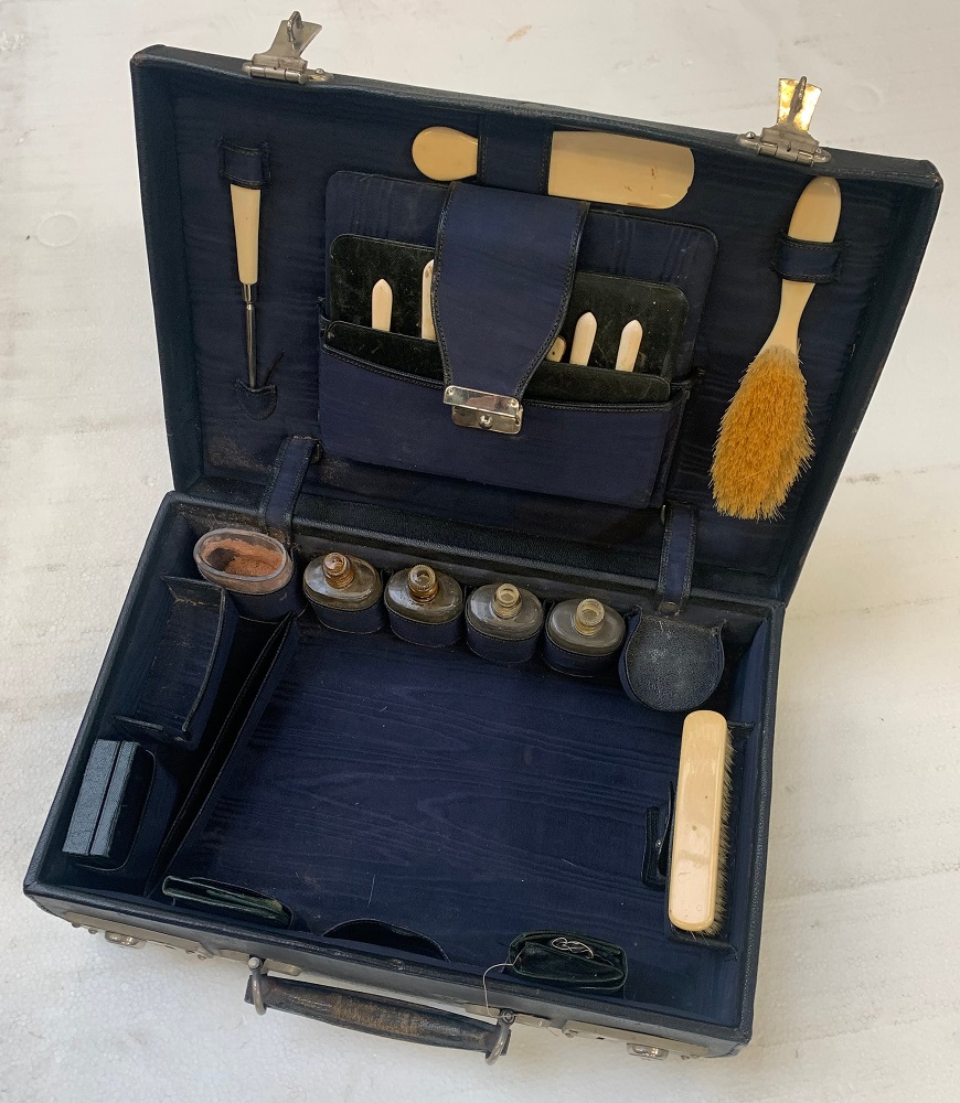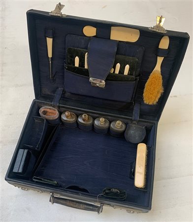 Servizio da toilette da viaggio con valigia, con elementi in avorio (cm 39,5x13x27,5) (difetti e mancanze)