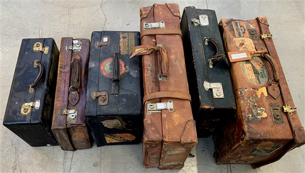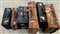 Lotto di sei valigie in cuoio e altri materiali di diversi colori e dimensioni (gravi difetti)