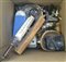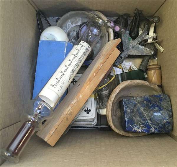 Cartone contenente numerosi oggetti di diversa epoca, materiale e decoro (difet