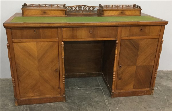 Scrivania da centro lastronata a due ante e tre cassetti sottopiano, alzata traforata a due cassetti, montanti a colonnine tornite. Secolo XIX (134x75,5x51) (difetti)