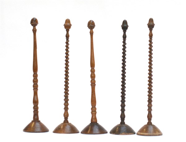 Gruppo di cinque fermaporte in legno tornito. Secolo XIX (difetti e mancanze)