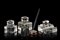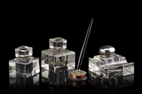 Lotto composto da tre portainchiostro ed un portapenne in vetro, metallo e bach