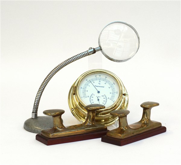 Lotto composto da una lente da tavolo, due fermacarte a forma di bitte e un termostato in ottone (difetti)