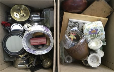Lotto composto da due cartoni contenenti numerosi oggetti di diversa fattura e