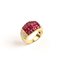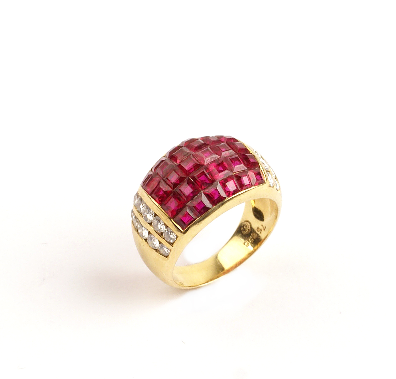 ANELLO A FASCIA IN ORO GIALLO 18KT con rubini taglio carrè per ct 2 circa e diamanti taglio brillante per 0,60 punti circa, misura 14 10 gr.