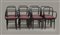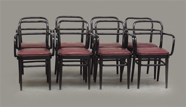 Lotto di otto poltroncine. Austria, 1957/1958. Legno di faggio curvato al vapore verniciato nero, seduta imbottita e rivestita in vinilpelle bordeaux. (cm 51x83x55) (difetti)