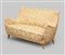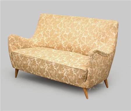 Divano a due posti imbottito e rivestito in tessuto damascato ocra, piedini troncoconici in legno. Italia, anni '50. (cm 146x81x74) (difetti)