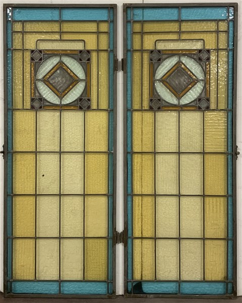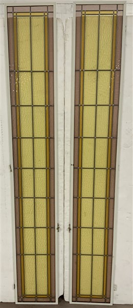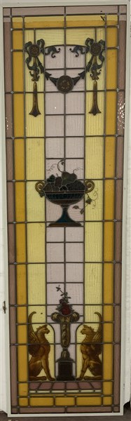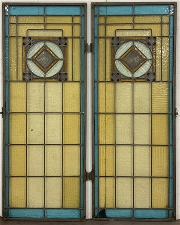 Lotto di cinque vetrate legate al piombo con inserti in vetro policromo dipinto. Italia, inizio secolo XX. (cm 34,5x206; cm 61x206; cm 52x135) (difetti)