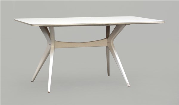 Tavolo in legno laccato bianco con piano in opalina bianca. Italia, produzione recente. (cm 161x78x90,5) (difetti e restauri)