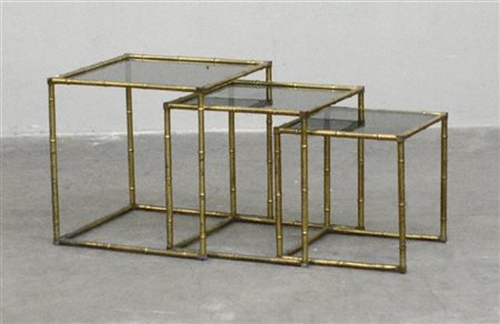 Tre tavolini a nido don struttura in ottone finto bamboo, ripiani in vetro fumé. Italia, anni '70. (tavolino grande cm 45x45x45; tavolino medio cm 41x41x41; tavolino piccolo cm 35x35x35) (difetti)