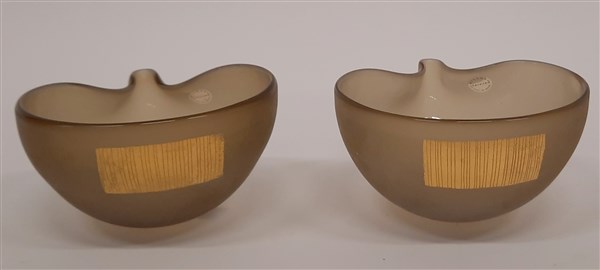 Lotto di due coppette della serie "Pizzicati". Probabile produzione Salviati. Murano, 2003. Vetro acidato trasparente grigio con decoro a foglia d'oro. Firmate a punta sotto la base. In scatola originale. (h cm 7; d cm 13)