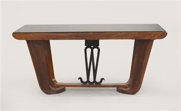 Tavolo in legno impiallacciato di palissandro indiano allungabile con gambe rastremate e di forma mossa, sostegno centrale in legno verniciato nero e sagomato a volute, piano in opalina nera. Italia, anni '40/'50. (cm 179x80x92) (difetti e mancanza delle prolunghe)