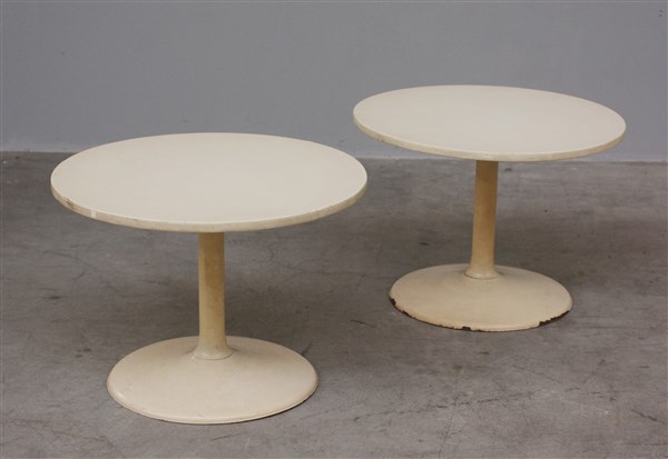 Lotto composto da due tavolini da salotto con piano circolare in legno verniciato bianco, base in metallo verniciato bianco. Italia, anni '70. (h cm 47; d cm 65) (difetti)