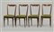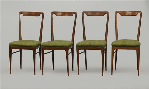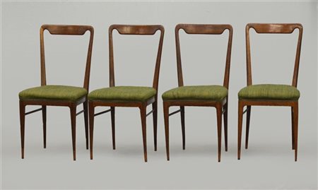 Lotto composto da quattro sedie con seduta imbottita e rivestite in tessuto verde, struttura in legno di mogano, piedini anteriori in ottone. Italia, anni '50. (cm 41x90x42) (difetti)