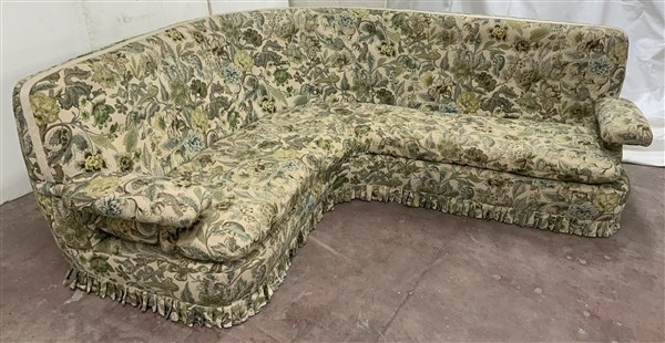 Divano angolare con braccioli imbottito e rivestito in tessuto floreale. Italia, anni '80. (cm 295x88) (difetti)