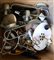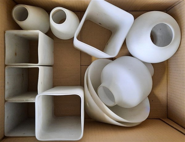Lotto composto da due cartoni contenenti strutture di lampade da parete e diffusori in vetro incamiciato lattimo di diverse forme. (difetti)