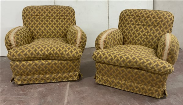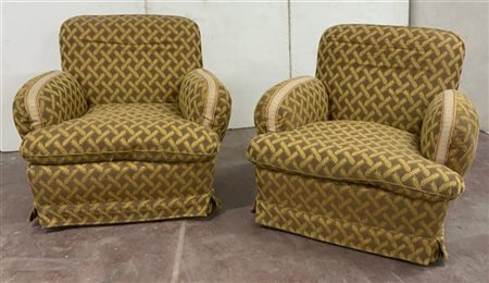Coppia di poltrone imbottite e rivestite in tessuto marrone decorato con motivi