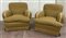 Coppia di poltrone imbottite e rivestite in tessuto marrone decorato con motivi vegetali color senape. Italia, anni '70/'80. (cm 87x83x92) (difetti)