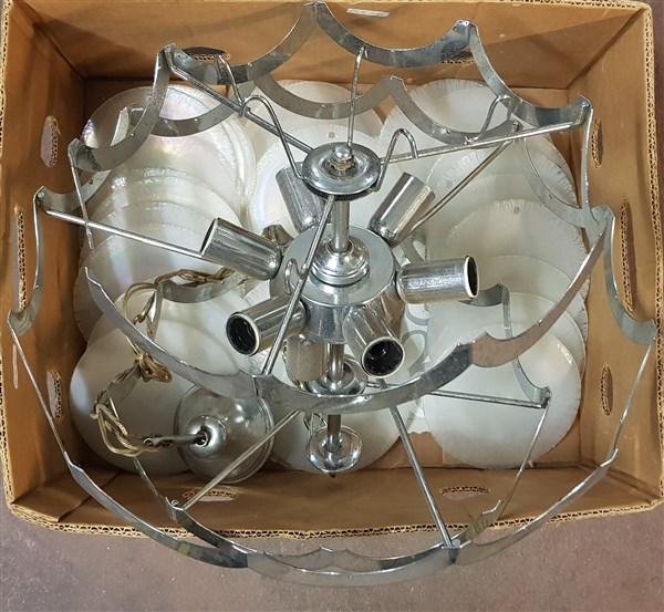 Parti di lampada a sospensione con struttura in acciaio cromato e dischi pendenti in vetro soffiato opalescente fortemente iridato sulla superficie esterna. Murano, anni '70. (difetti)