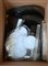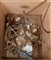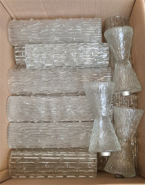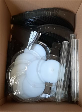 Lotto composto da tre cartoni contenenti strutture di lampade a sospensione e pendenti in vetro di diverse manifatture, colore e forme. Italia, secolo XX. (difetti)