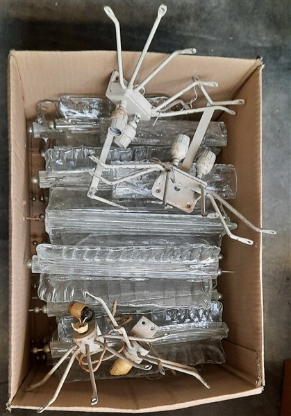 Cartone contenente quattro strutture per lampade da parete in metallo verniciato bianco e pendenti in vetro trasparente incolore formato in stampo con superficie corrugata di diversa fattura. Italia, secolo XX. (difetti)