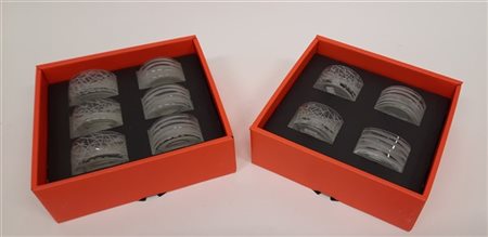 Due servizi di sei e quattro portacandele assortiti della serie "Twigs" e "Graffiati". Murano, produzione recente. Vetro trasparente incolore inciso alla mola e parzialmente acidato. Marcati sotto la base. In scatole originali. (h cm 5,9)