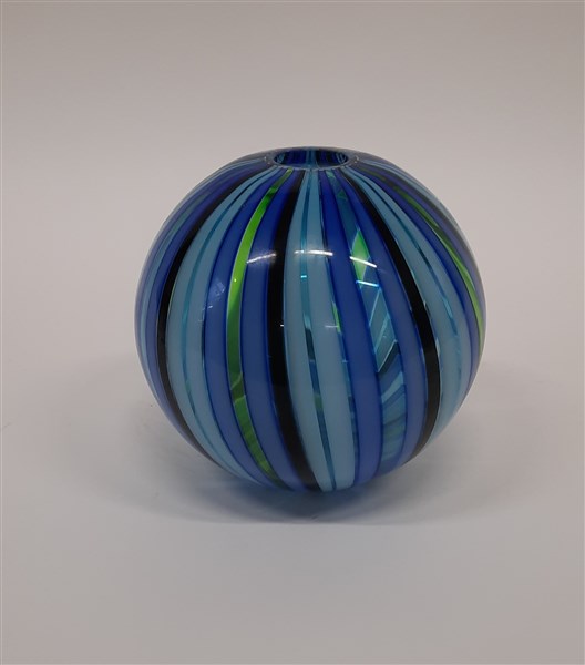Vaso sferico della serie "Perles". Murano, 2010. Vetro trasparente incolore a fasce blu, azzurre e verdi. Firmato e datato a punta sotto la base. In scatola originale. (h cm 16; d cm 16,8)