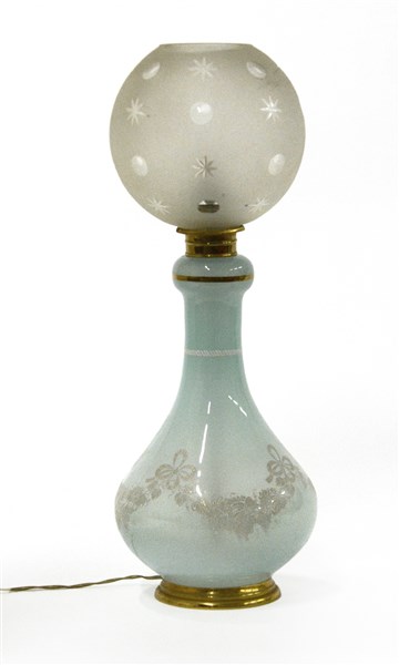 Lampada da tavolo con struttura in ottone, fusto in vetro soffiato azzurro con decori di viti ed uva in dipinti in bianco, diffusore globulare in vetro soffiato trasparente incolore parzialmente acidato sulla superficie esterna con decori a tondi e stelle. Italia, secolo XX. (h cm 56,5) (lievi difetti)