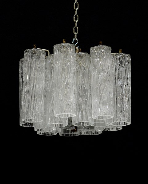 Lampada a sospensione con struttura in metallo verniciato bianco, pendenti cilindrici in vetro cristallo corrugato soffiato in stampo disposti su due ordini, disco di chiusura e rosetta in metallo. Murano, anni '70. (h cm 25; d cm 38) (difetti)