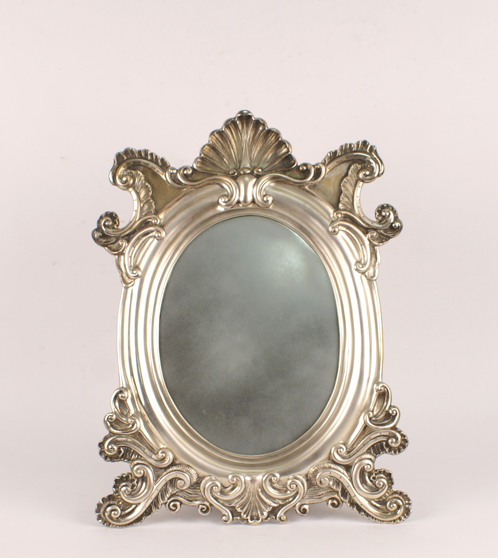 SPECCHIERA DA TAVOLO IN ARGENTO manifattura italiana decorata a motivi di volute, cm. 42x31 614 gr.