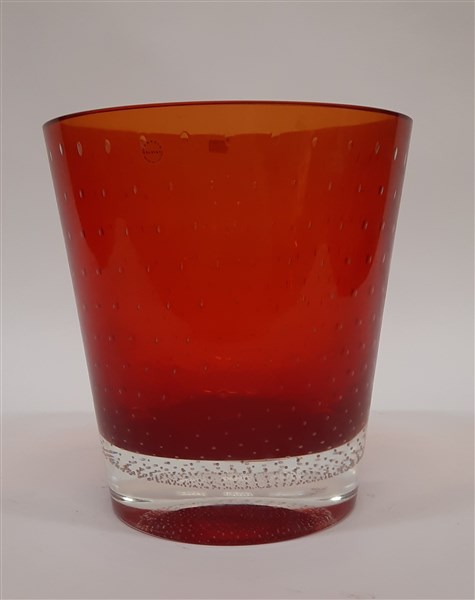 Vaso. Murano, 2009. Vetro trasparente rosso con inclusione di bolle. Firmato e datato a punta sotto la base. In scatola originale. (h cm 24,5; d cm 23,5)