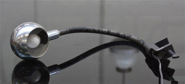 Lampada da tavolo con braccio snodabile, paralume in alluminio. Italia, secolo