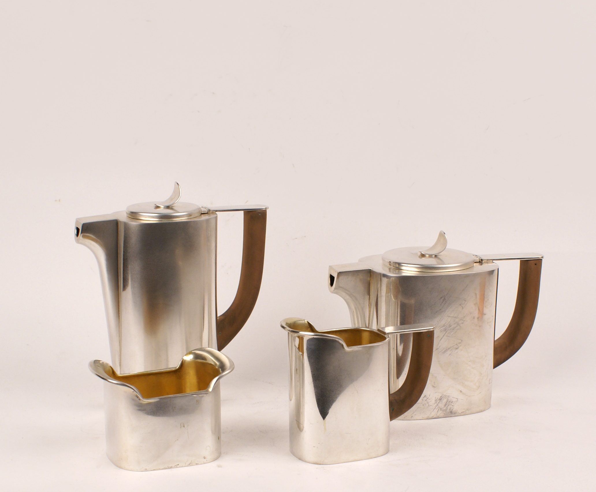 SERVIZIO THE E CAFFÈ IN ARGENTO manifattura italiana a corpo liscio di linea squadrata, composto da una teiera, una caffettiera, una lattiera e una zuccheriera 1715 gr.