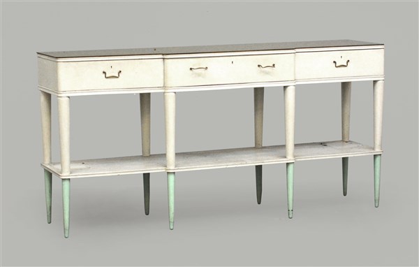 Consolle a tre cassetti e un ripiano a giorno in legno verniciato bianco e azzurro con piano in vetro retroverniciato verde. Italia, anni '40. (cm 200x99x50) (difetti e restauri)