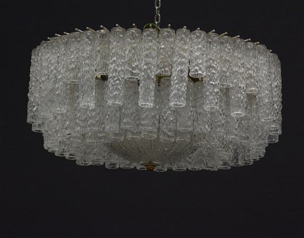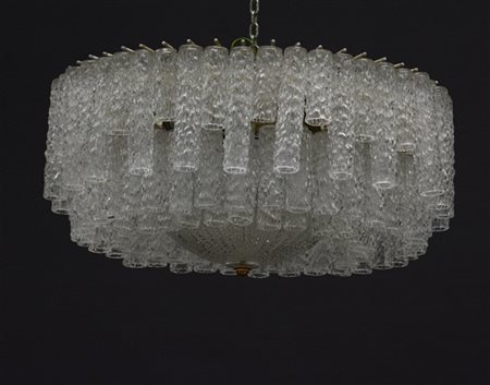 Lampada a sospensione con struttura in metallo verniciato bianco, pendenti cilindrici in vetro cristallo corrugato soffiato in stampo disposti su tre ordini, coppa di chiusura e rosetta in metallo dorato. Murano, anni '70. (h cm 30; d cm 66)