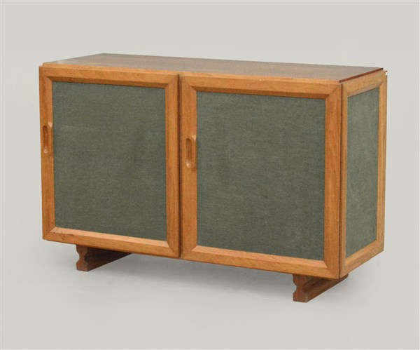 Mobile contenitore a due ante a produzione artigianale in legno impiallacciato imitanti il gusto di Franco Albini. Fianchi e fronte rivestiti in velluto verde. Italia, seconda metà secolo XX. (cm 127,5x82,5x46) (lievi difetti)