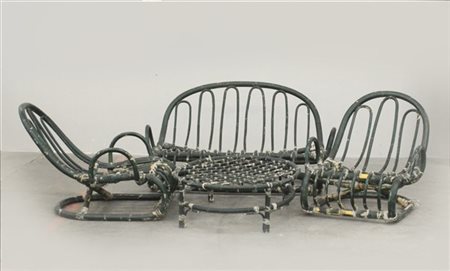 Salottino da esterno composto da un divanetto, due poltrone e tavolino in malacca o manao verniciato verde con legature in scortecciato. Italia, anni '50. (divanetto cm 135,5x69x100; poltrone cm 74x68x97; tavolino cm 101x30x78) (gravi difetti)