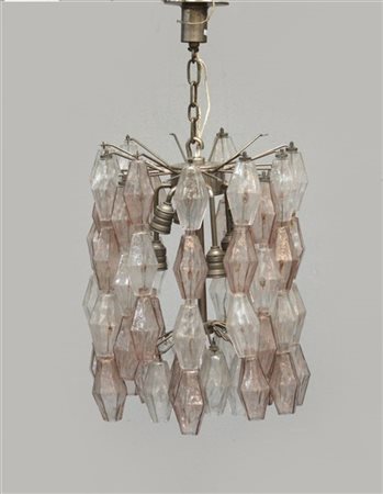 Lampadario a poliedri in vetro incolore e rosa soffiato in stampo e leggermente iridato e struttura in metallo nichelato. Venini, Murano, 1958ca. Marcato a incussione sulla struttura. (difetti e mancanze)