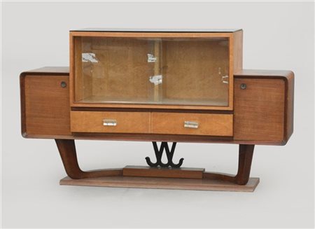 Controbuffet in legno impiallacciato e bordato di palissandro indiano e radica con corpi laterali con scomparti ad anta e parte centrale a due cassetti e vetrinetta ad ante scorrevoli con due ripiani in cristallo. Maniglie dei cassetti in cristallo e ottone. Sovrapiano in opalina nera. Sostegno centrale in legno verniciato nero e sagomato a volute. Italia, anni '40/'50. Recante etichetta "Ambrosetti Lissone" sul retro. (cm 190x111,5x46,5) (difetti)