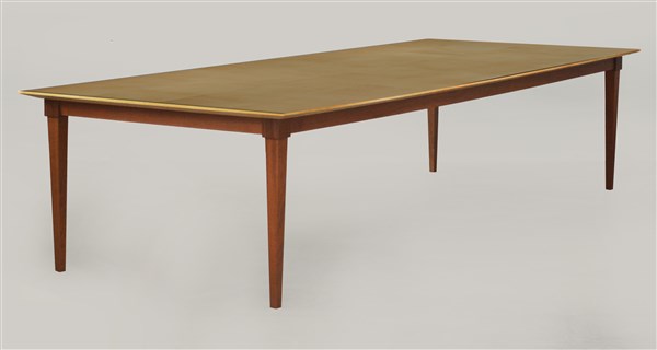Grande tavolo da riunioni con gambe troncopiramidali in legno di rovere e piano rivestito in pegamoide. Italia, anni '90/2000. (cm 320x74x128) (lievi difetti)