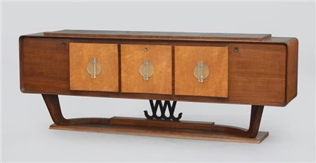 Buffet a cinque ante in legno impiallacciato e bordato di palissandro indiano e radica con maniglie delle ante centrali in cristallo e ottone. Scomparto centrale portabottiglie apribile a ribalta. Sostegno centrale in legno verniciato nero e sagomato a volute. Italia, anni '40/'50. (cm 250x92x49,5) (difetti)