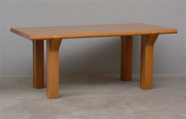 Tavolo da pranzo di forma rettangolare con struttura in legno chiaro, gambe quadrate. Italia, anni '90. (cm 180x74x87) (lievi difetti)