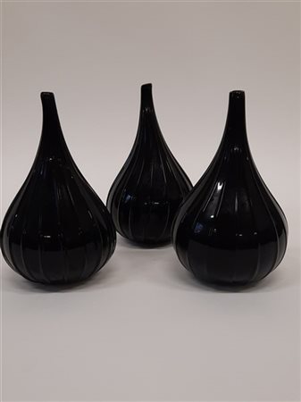 Lotto composto da tre vasi soliflore della serie "Drops". Murano, produzione recente. Vetro nero. Firmati e datati all'acido sotto la base. Una scatola originale. (h cm 20)