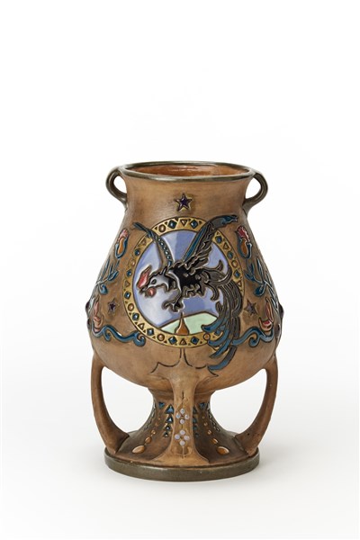Vaso biansato in ceramica smaltata opaca e sotto vetrina in policromia, con rilievi e graffiti vegetali di gusto Art Nouveau, tondi iscritti e decorati con un gallo nero e un mezzobusto femminile coronato. Imperial Amphora Turn, Austria, inizio secolo XX. Marcato sotto la base. (h cm 30) (lievi difetti)