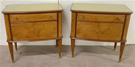Coppia di comodini a un cassetto e antina in legno impiallacciato in radica, pi
