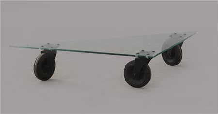 Tavolino da salotto su rotelle di forma triangolare con ripiano in cristallo. Italia, anni '80. (cm 154,5x37x78) (difetti)